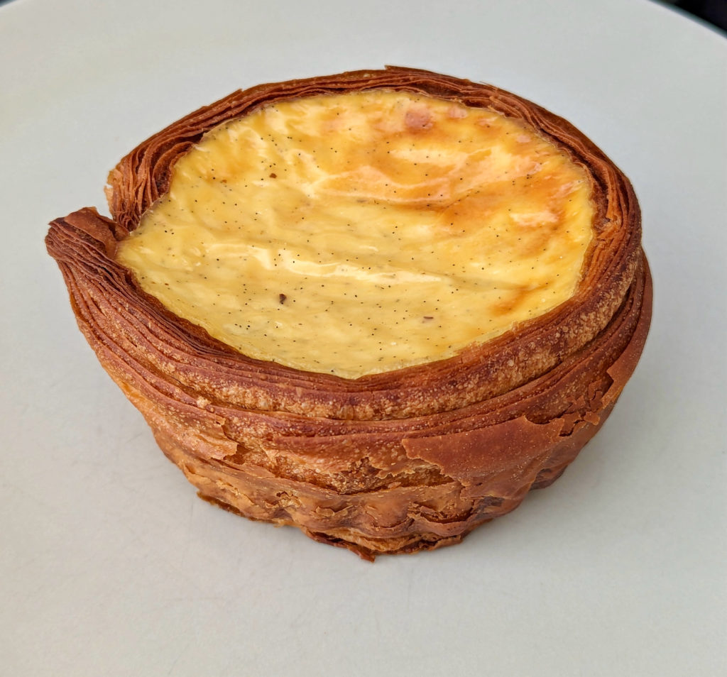 D’une belle hauteur, ce flan vanillé, dont le feuilletage ambré témoignant d’une cuisson très poussée, happait mon regard. Ses feuillets, distincts et parfaitement développés, conféraient une touche d’élégance et de volume.