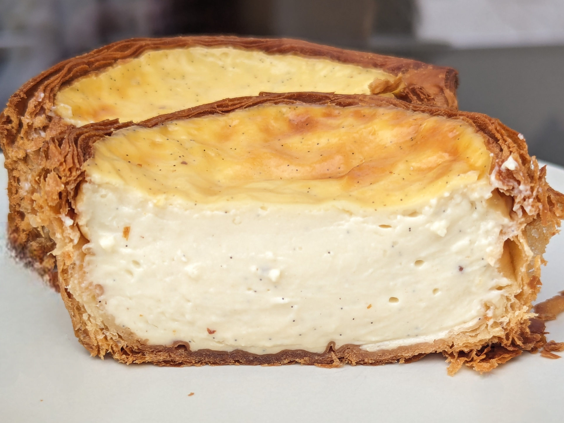 La croustillance exacerbée du feuilletage contrastait, de manière appuyée, avec l’appareil dense, légèrement tremblotant, très crémeux, tout en gardant une délicate résistance. Peu sucré, Il dévoilait sa musique envoûtante et harmonieuse sur les papilles. Une certaine lenteur s’imposait pour savourer ses notes rondes, florales et d’amande sur le palais qui berçaient mes sens. Les notes grillées du feuilletage, offraient du caractère à l’ensemble et les grains de vanille craquaient malicieusement sous les dents ajoutant du relief et accentuant le contraste des textures