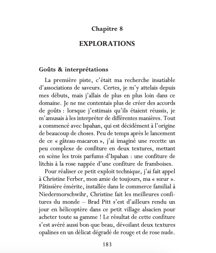 Même face à des défis, comme celui de trouver une alternative aux framboises fraîches pour son Ispahan, le chef ne cesse d’innover. Son esprit de transmission se manifeste également à travers son désir d’éduquer le goût, un aspect qu’il aborde implicitement tout au long de son ouvrage