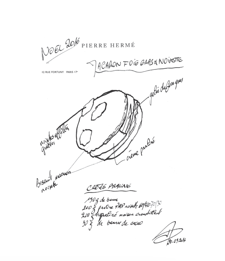 L’esthétique de rupture : Hermé brise les codes visuels traditionnels de la pâtisserie pour introduire une esthétique épurée et moderne, où chaque détail compte. Inspiré par le monde de l’art, notamment par des artistes comme Joana Vasconcelos, il dessine chaque gâteau avant sa création pour mieux réfléchir à la composition des saveurs.
