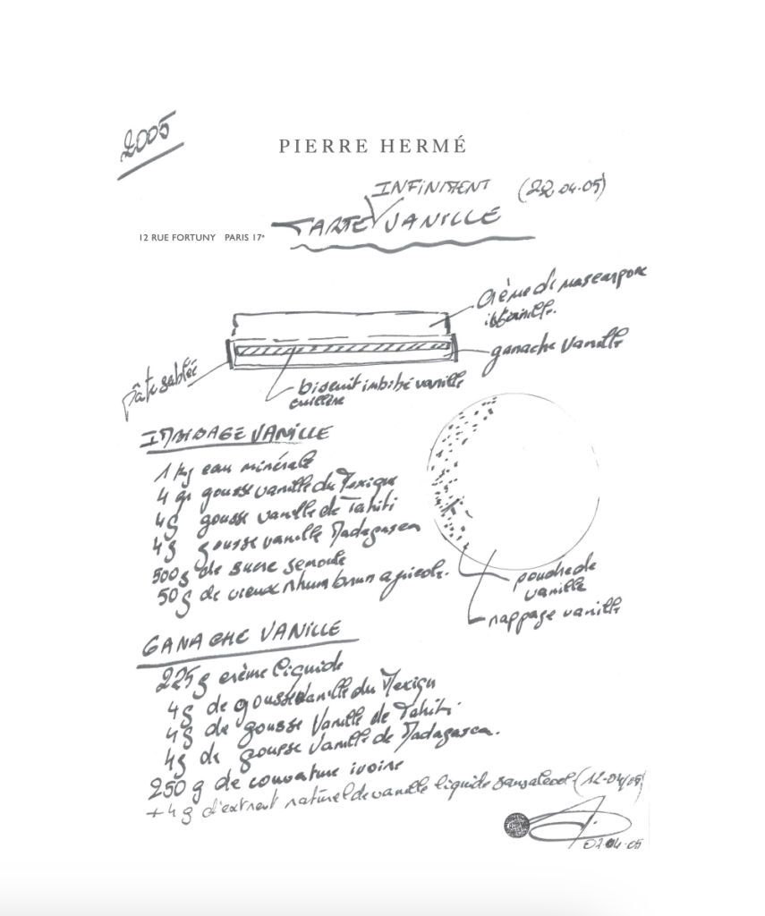 Sa quête a atteint un tournant lors de sa rencontre avec l’œuvre d’Yves Klein en 2005, qui l’a inspiré à aborder la vanille comme une couleur à travailler par touches successives, dans un processus de perfection progressive. Avec l’aide de Laurence Cailler-Larcebeau, une sourceuse experte, Hermé a parcouru le monde à la recherche de vanilles rares et précieuses. C’est ainsi qu’il a composé la tarte Infiniment Vanille, une ode à cet ingrédient, un hommage à sa majesté. Cet exercice minutieux a ensuite été appliqué à d’autres saveurs signatures, comme l’Infiniment Café ou l’Infiniment Noisette.
