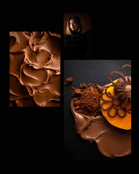 Les textures : Chaque chef a travaillé une texture spécifique du chocolat, mettant en avant la diversité infinie de cette matière. Par exemple, Laurie Schmid( pâtissière) a exploré le coulant avec une création multi-texture centrée sur une sauce chocolat brillante et une ganache fondante. Marine Mateos ( Formatrice CFA Médéric) a représenté le chocolat dans sa texture onctueuse, tandis que Sabrina Allard( pâtisserie Mélilot) a choisi la dualité crousti-fondante à travers un brownie. Géraldine capte ces textures avec une précision presque tactile, permettant au spectateur de ressentir la matière par le regard.