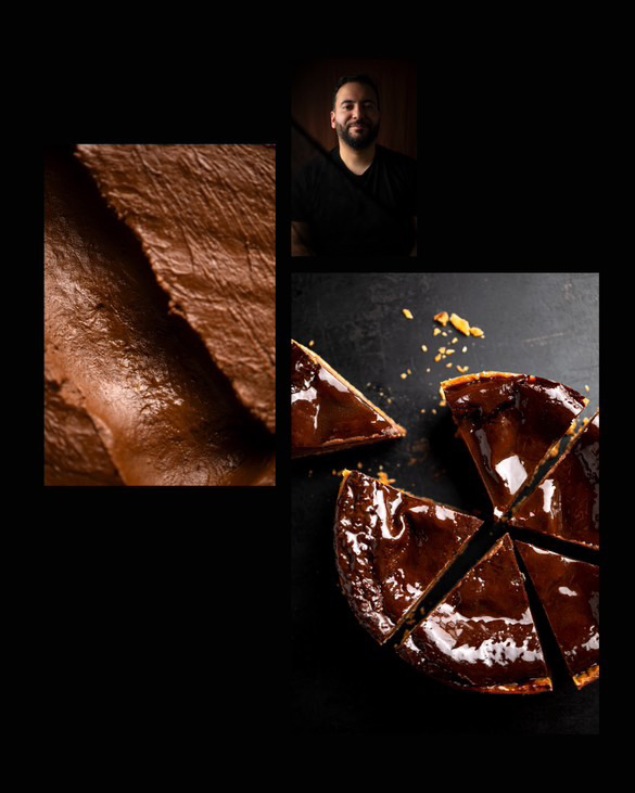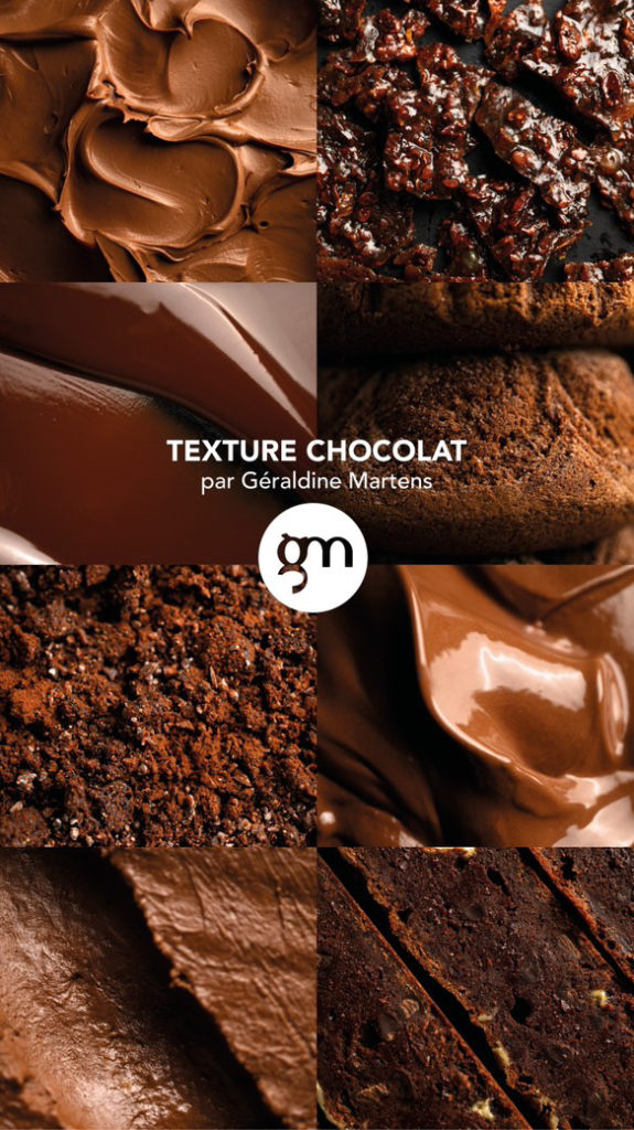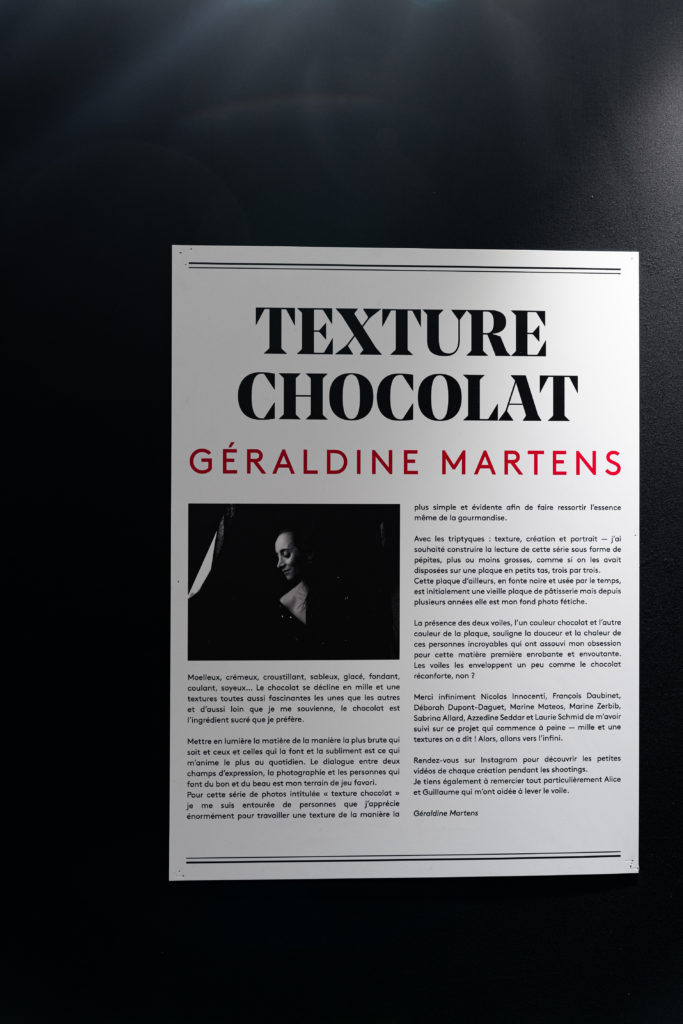 Avec « Texture Chocolat », Géraldine redéfinit la photographie culinaire en explorant le chocolat comme une matière vivante,expressive et universelle. À travers ses triptyques, elle révèle non seulement la beauté brute du chocolat, mais aussi les histoires humaines et émotionnelles qui lui sont intrinsèquement liées, notamment à travers les portraits de huit chefs : Marine Zerbib, Marine Mateos, Nicolas Innocenti (chef pâtissier des restaurants « Ochre » et « Sienne »), François Daubinet (Artiste pâtissier), Sabrina Allard, Laurie Schmid, Azzedine Seddar ( chef pâtissier – Stohrer) et de la libraire : Déborah Dupont-Daguet ( la Librairie Gourmande). Chaque portrait incarne une rencontre entre le chef et la matière, ajoutant une dimension humaine et intime à l’œuvre.