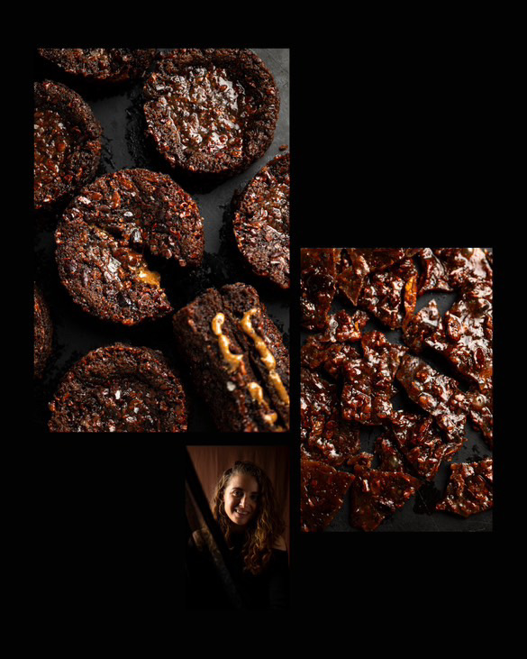 Les créations : Simples mais gourmandes, les desserts et pâtisseries photographiés vont à l’essentiel en travaillant des cookies ou encore des brownies.