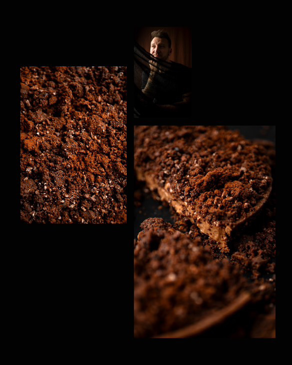 Les portraits : Chaque chef est photographié dans un environnement épuré, entouré de voiles de lin marron-chocolat et noir, qui rappellent à la fois la matière travaillée et le fond noir de la série. Ces portraits captent l’essence de la personne, sa relation avec sa création et le chocolat. Pour Géraldine, cette matière devient le miroir de la personnalité du chef, reflétant ses intentions, son caractère et ses émotions.