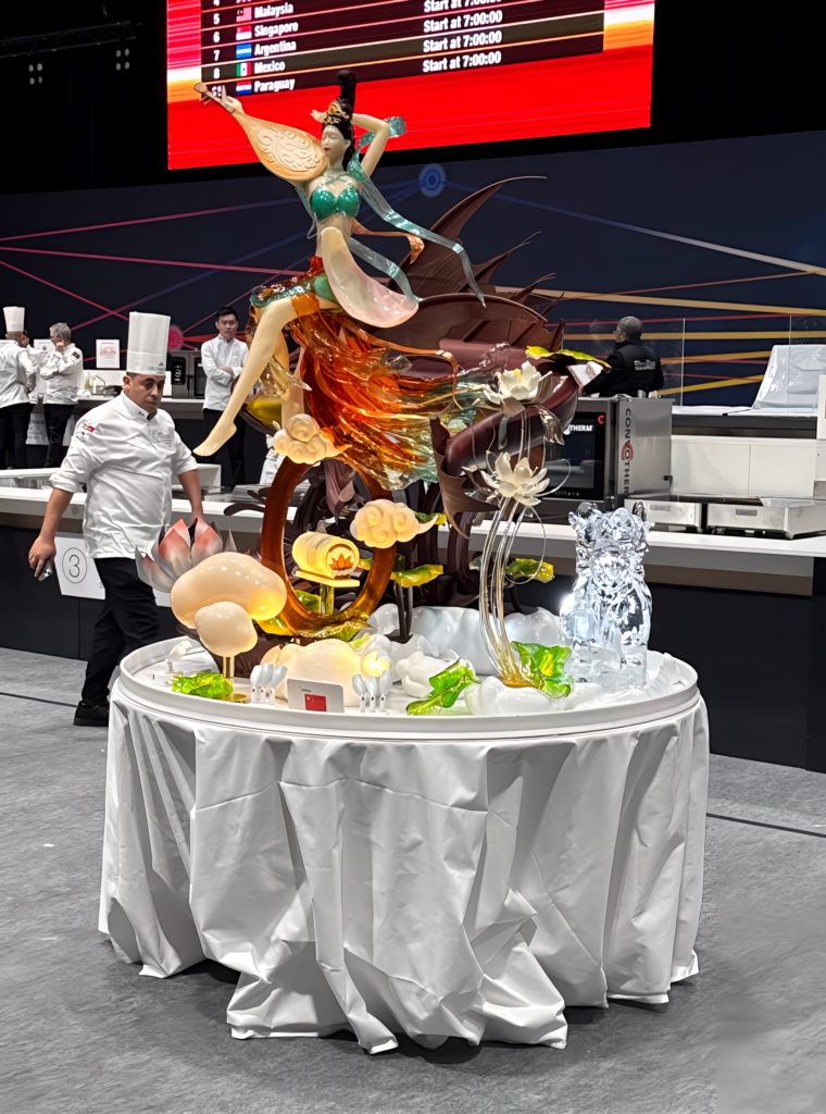 - Chine : L’instrument de musique en chocolat, inspiré des motifs de la ville de Dunhuang, avait été un moment didactique et artistique fort. Le mélange de danse traditionnelle et de création avait fait écho à l’héritage culturel chinois, offrant au public une immersion complète. Ce fut un beau moment de culture, alliant beauté et créativité, tout en rendant hommage à une tradition chinoise dans un contexte moderne.