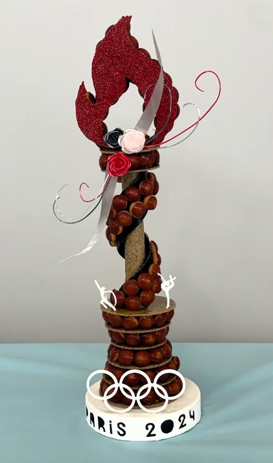 L’an dernier, Maïa et Rémi ( étudiants à l’IRFMA Hérault à Montpellier) avaient impressionné le jury avec leur Croquembouche sur le thème des JO. Ils avaient représenté la flamme olympique et la couronne de lauriers qui incarne la victoire. Ils avaient aussi représenté le logo des JO de Paris 2024 et Notre-Dame de Paris.
