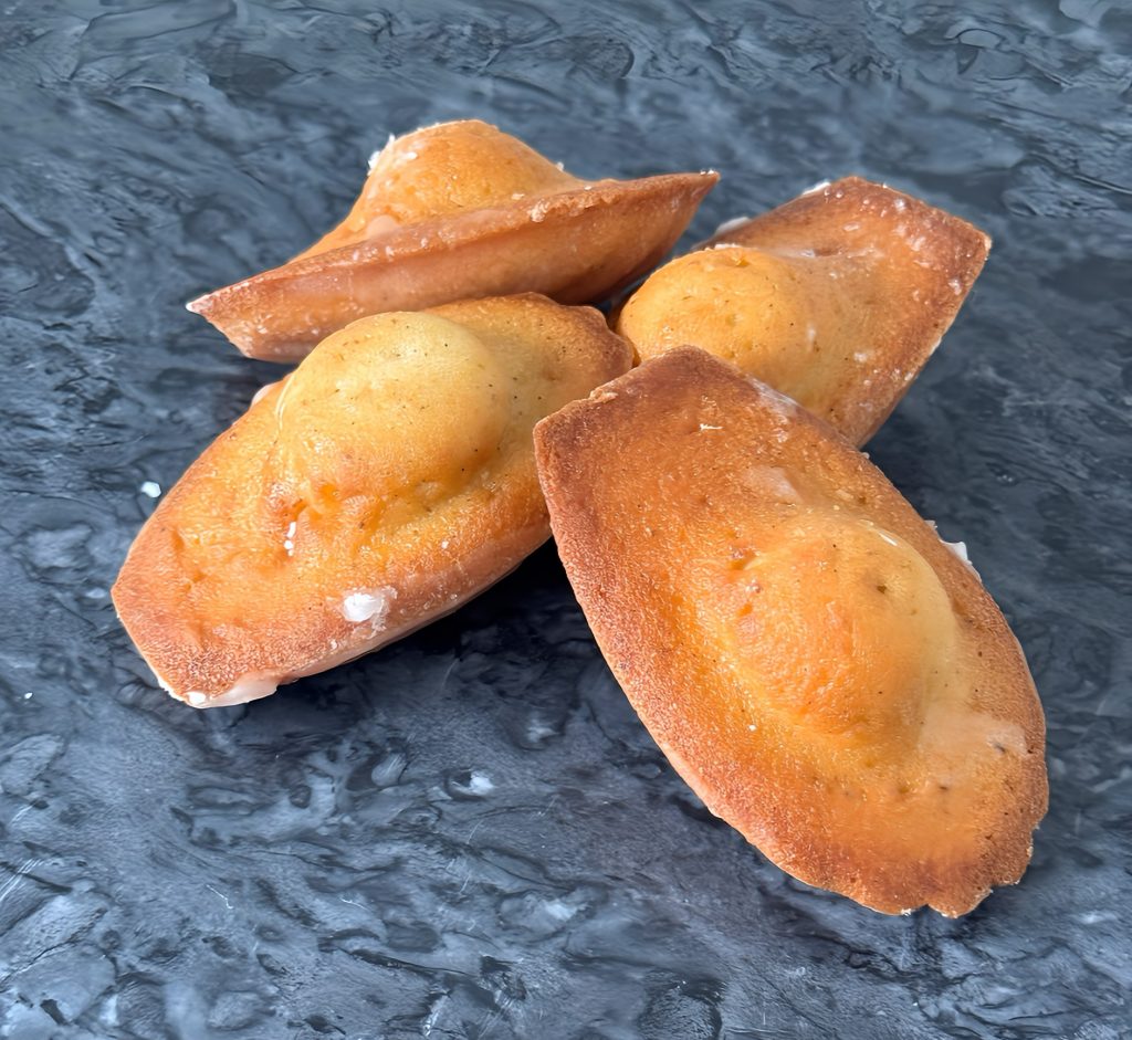 - Des madeleines citronnées, au cœur dense et moelleux, où l’acidité du citron équilibre le côté gras du beurre, adoucie par une touche de vanille.