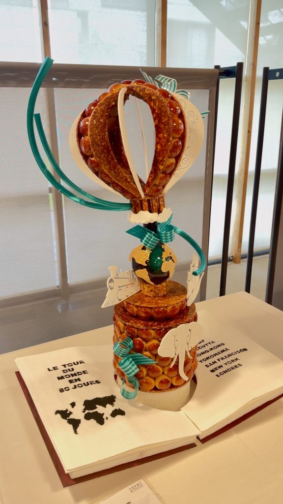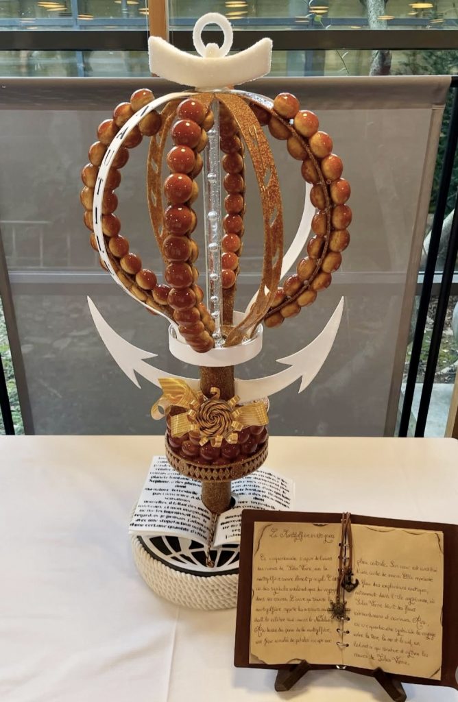 Parmi les croquembouches exposés, celle d’Haoua et Erwan a retenu mon attention. Inspirée par l’univers de Jules Verne, leur pièce artistique alliait poésie et imagination: « C’était super inspirant, il y avait beaucoup à dire. Avec le thème de Jules Verne, on peut vite s’éparpiller… Heureusement, on a été bien accompagnés : ils ont su nous encadrer pour éviter de faire une pièce trop chargée », raconte Haoua.
