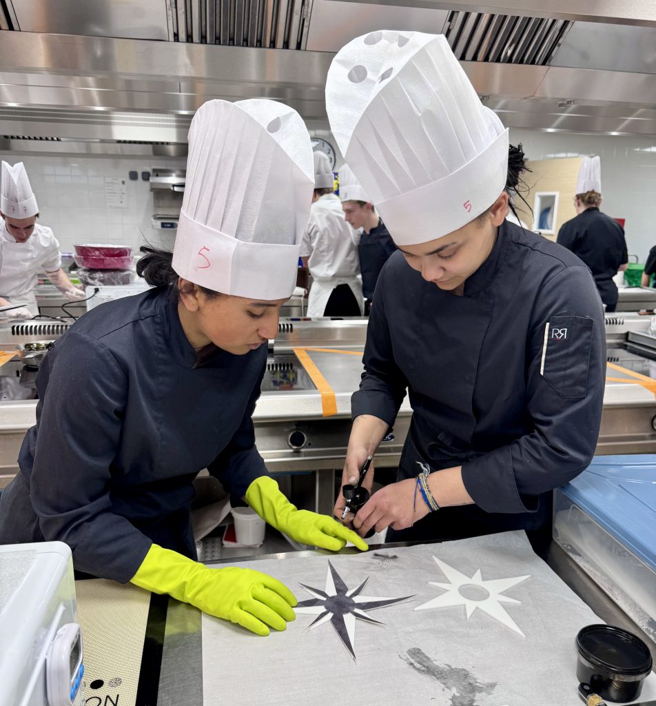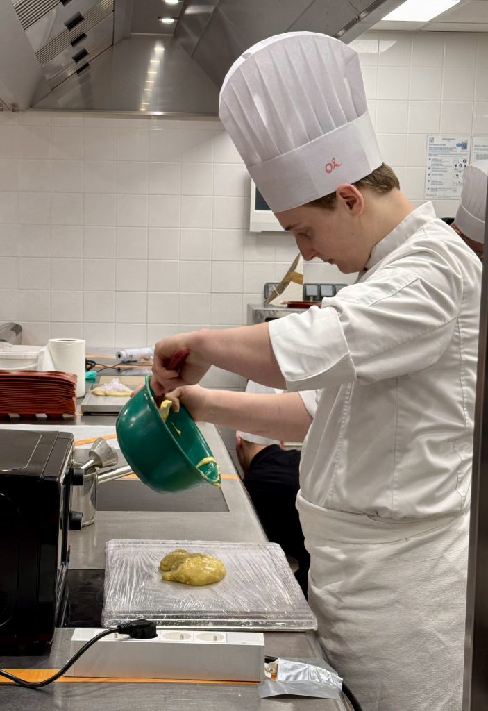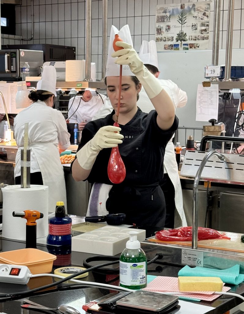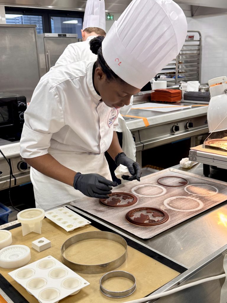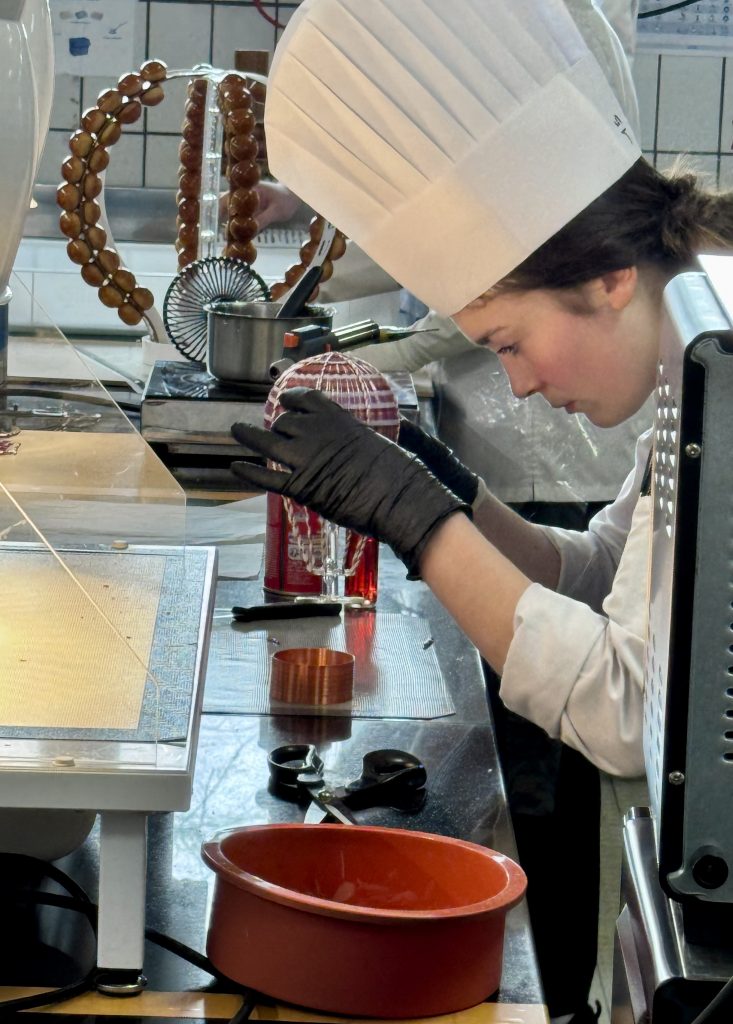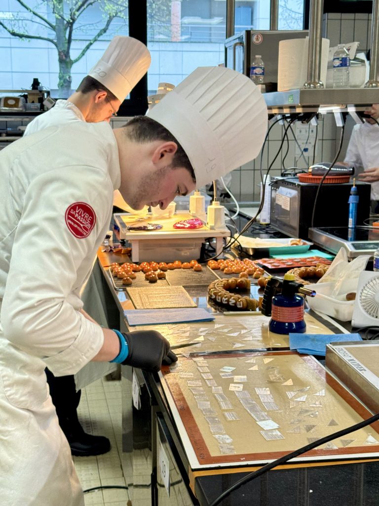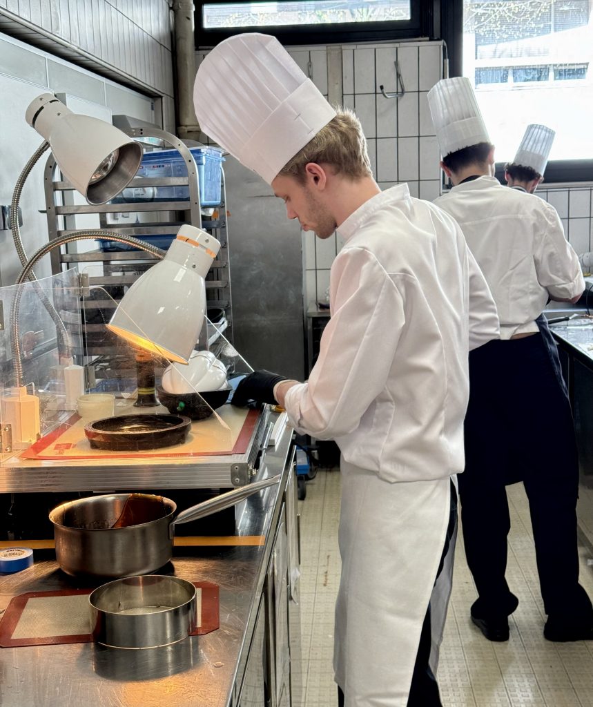 Le laboratoire 3 abrite plusieurs équipes qui se démarquent déjà par leur maîtrise, leur sens de l’esthétique et leur créativité, notamment l’équipe 12 (Matthias et Tanguy), l’équipe 15 (Chloé Esmault et Mathéo Lopez) et l’équipe 21 (Paul Haezebaert et Maxence Ieng). L’un des candidats surveille attentivement la cuisson de son caramel, maintenu entre 160 et 180 degrés, une étape importante où la moindre inattention pouvait transformer un caramel bien doré en une masse brûlée.