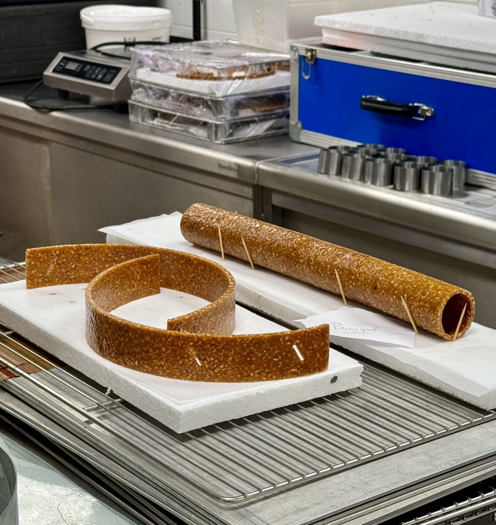 Pendant ce temps, dans les laboratoires, les sculptures en sucre et nougatine prennent progressivement forme, défiant la gravité dans un fin jeu de précision et d’équilibre. À ce stade, l’isomalt devient le meilleur allié des candidats : ce substitut de sucre de betterave, prisé pour sa transparence et sa stabilité, est utilisé en guise de colle pour fixer les pièces entre elles. Plus résistant à l’humidité que le sucre traditionnel, il est indispensable pour assembler des structures complexes, notamment les éléments élancés et les pièces aériennes qui donneront aux croquembouches toute leur grandeur. Mais il demande une parfaite maîtrise : chauffé trop fort, il jaunit et devient cassant ; trop froid, il ne fixe pas correctement. Chaque équipe doit jouer avec la température et la rapidité d’exécution pour réussir un collage propre et solide tout en composant avec l’ennemi des candidats : l’humidité des laboratoires.