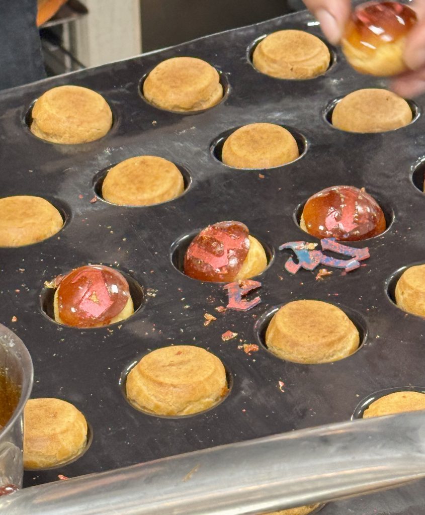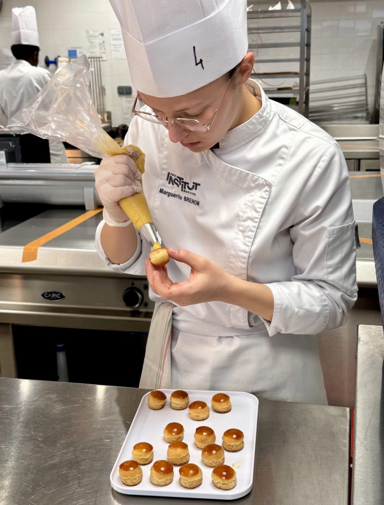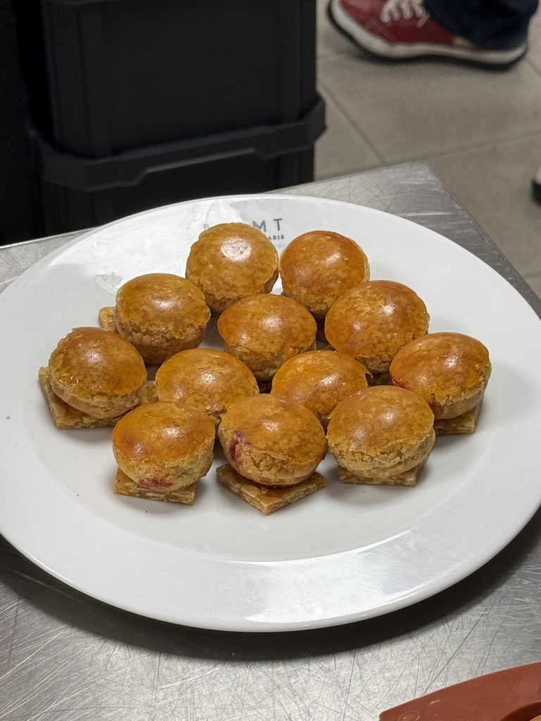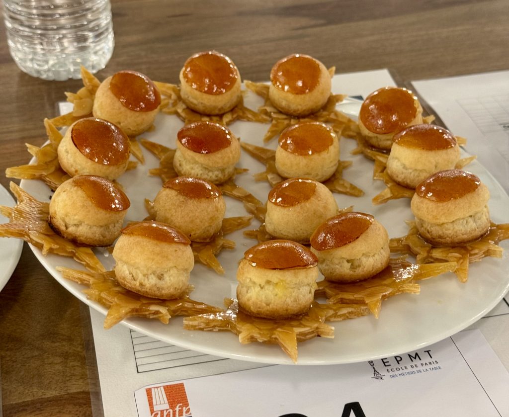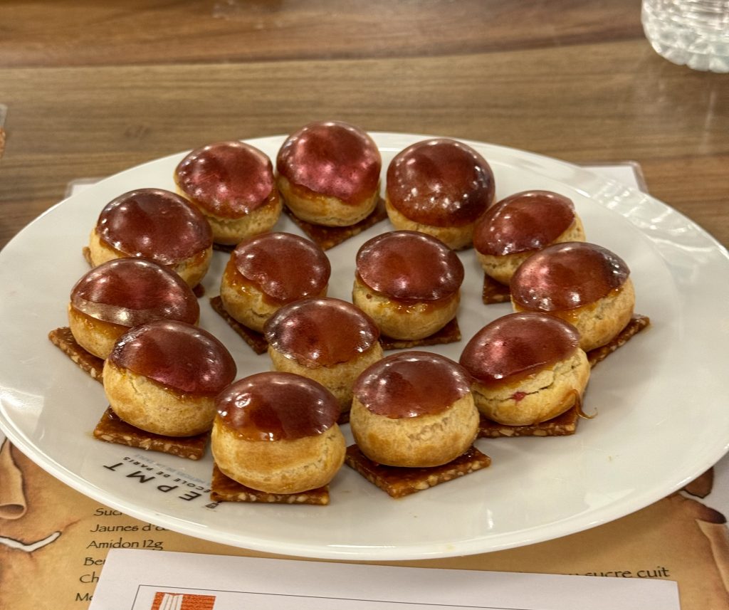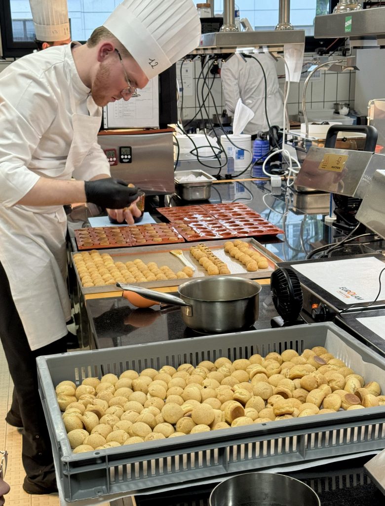 Dans un silence quasi religieux, le jury dégustation, composé également d’Arnaud Mathez du Jardin Sucré et des formateurs de l’AFNP comme Alain Colomb ou Martial Teyrasse, poursuit son travail méticuleux. La 11ᵉ équipe est à l’épreuve, et il reste encore 11 assiettes à analyser. Chaque dégustation fait l’objet une évaluation méticuleuse où la moindre variation de texture ou de saveur peut faire basculer le verdict. La coque des choux doit être parfaitement cuite : ni trop sèche, ni trop molle, avec cette fine résistance sous la dent avant de révéler une crème délicate et justement dosée en sucre. Le caramel, lui, doit être fluide mais pas collant, apportant une touche doucereuse sans masquer les arômes du fruit. Tout est scruté avec une précision implacable, car dans ce concours, la perfection est la seule norme acceptable.