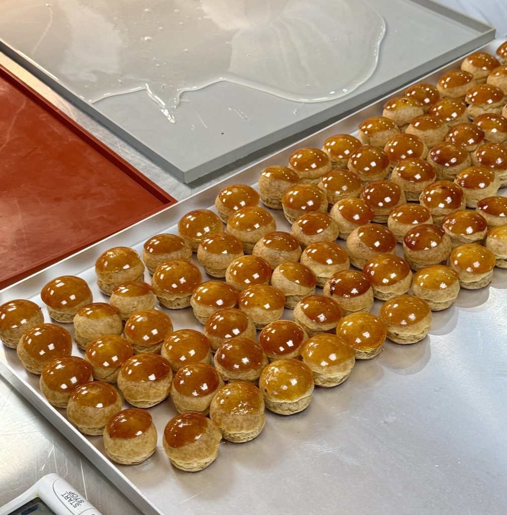 Soudain, une odeur âcre se répand depuis le laboratoire 3, probablement un caramel trop poussé par un candidat absorbé par une autre tâche. Face à cette urgence, les candidats s’empressent de plonger leurs choux dans le caramel liquide pour obtenir une surface lisse et brillante. Certains candidats, comme Tanguy Le Strat, optent pour une technique particulière en pochant directement le caramel dans des moules en silicone avant d’y déposer les choux, assurant ainsi régularité et uniformité. D’autres ont fait preuve de plus de créativité en inscrivant des numéros sous le glaçage au caramel.