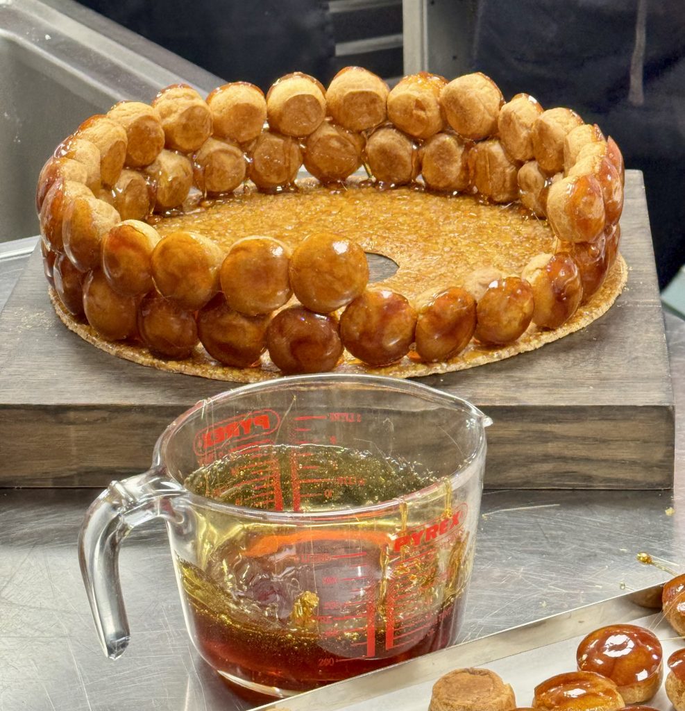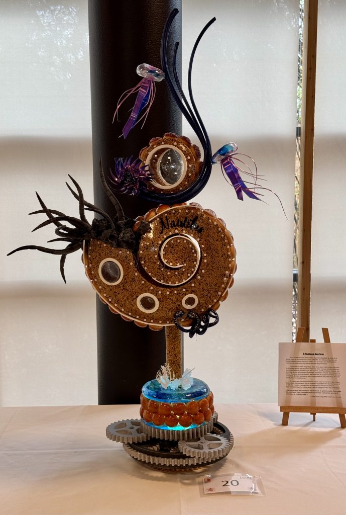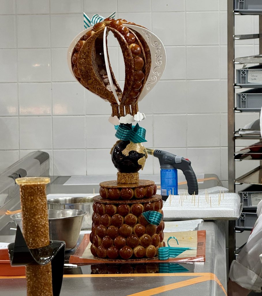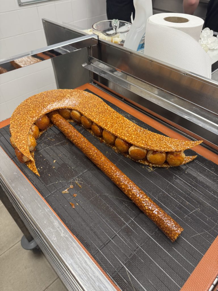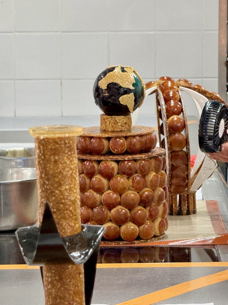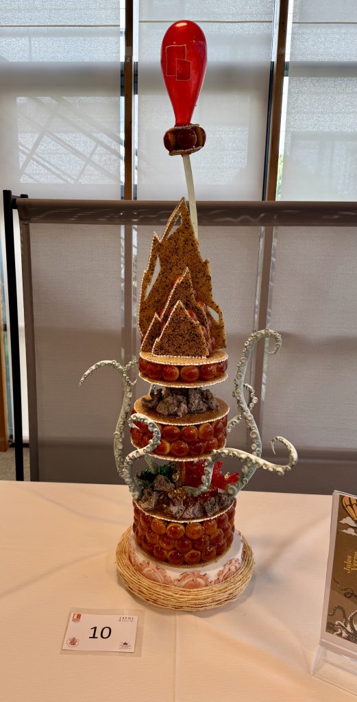 Chaque pièce et chou était d’une belle précision, régularité avec une nougatine parfaitement caramélisée, un travail de pastillage et de sucre tiré bien maîtrisé. Le tout formait une sculpture audacieuse, bien équilibrée, à la fois poétique et élégante.