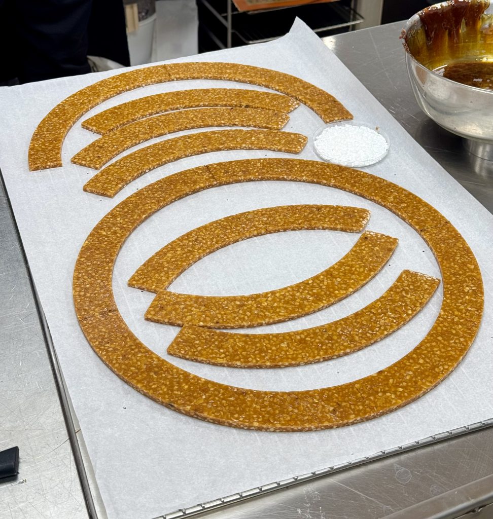 À ce stade de la compétition, les pièces en nougatine détaillées mais non assemblées et non décorées sont déjà visibles sur les plans de travail : barres, courbes, cercles et arcs de cercles, conformément au règlement du concours. Dans le laboratoire 2, l’équipe d’Annabelle et Aaliyah réalise des tests pour colorer leur étoile en forme de boussole, peut-être en référence au roman « Les Sphinx des glaces » ou au « Tour du Monde en 80 jours ».