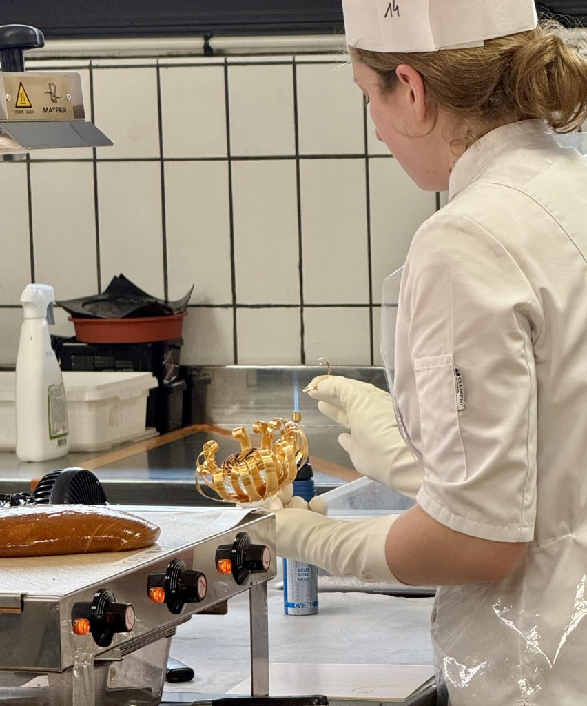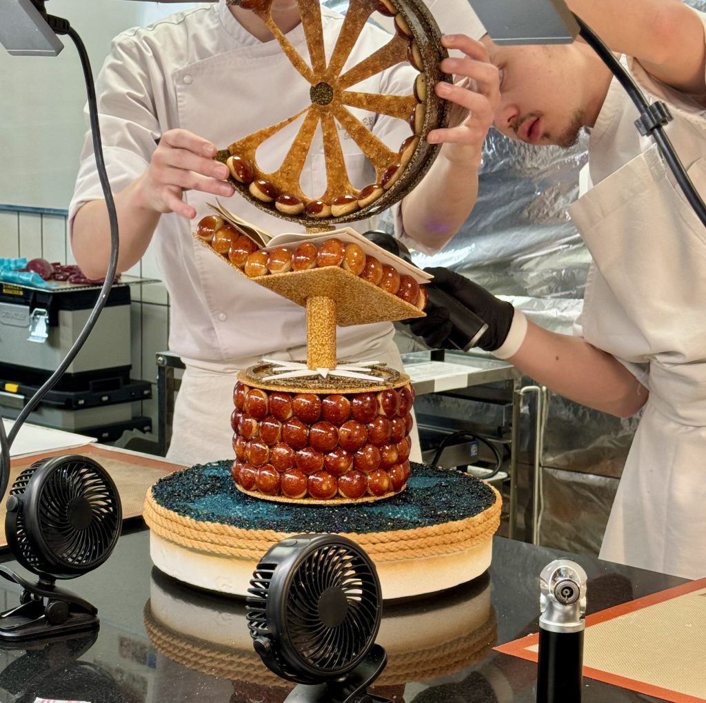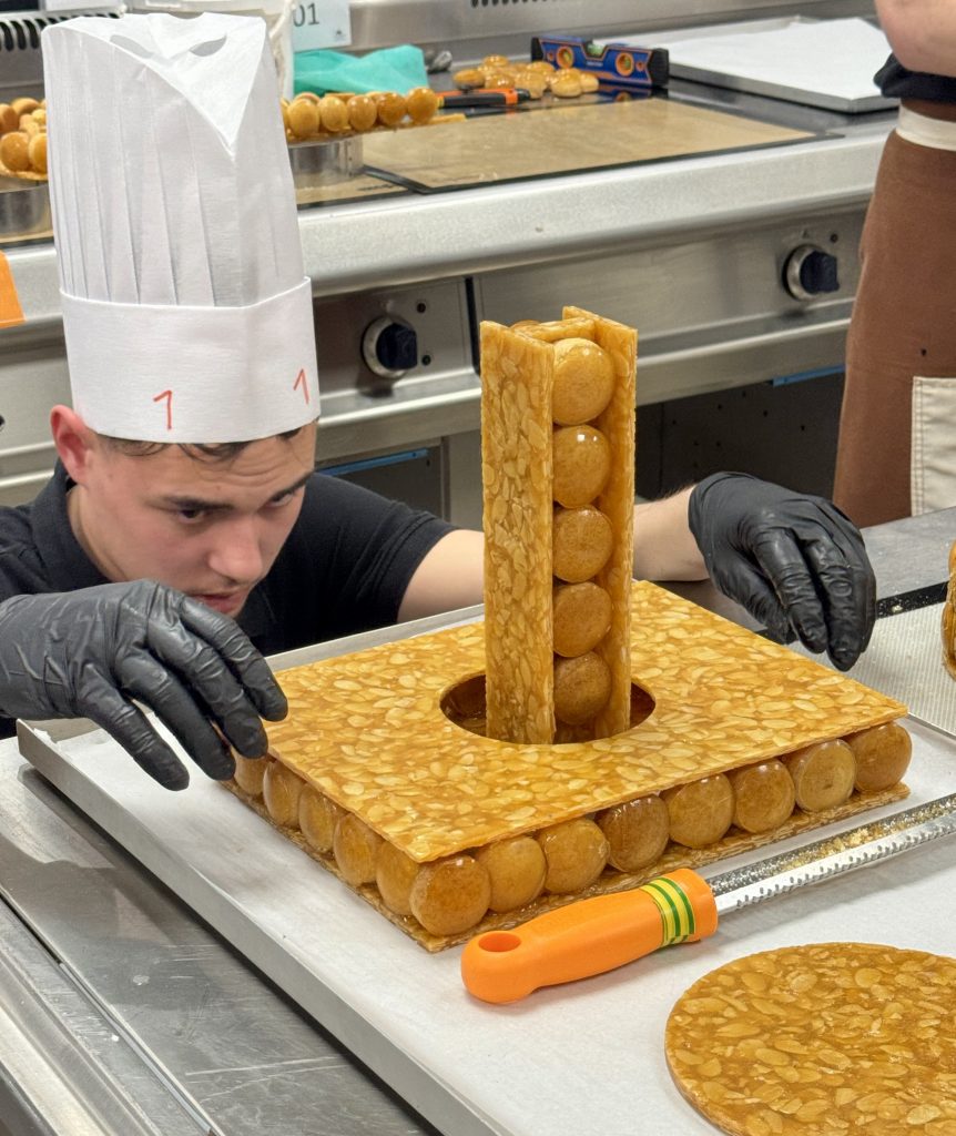 Un coup d’œil à l’horloge suffit à faire monter l’adrénaline : Nicolas Bernardé, MOF pâtissier et Président du jury, annonce d’une voix ferme qu’il ne reste qu’une heure avant la présentation finale. Dans la salle, le rythme s’accélère. Plus question d’hésiter : chaque candidat doit finaliser son œuvre en veillant aux moindres détails. Les décors en sucre tiré doivent être impeccablement formés, les pièces en nougatine solidement fixées, et les choux disposés avec harmonie pour un bel effet visuel.