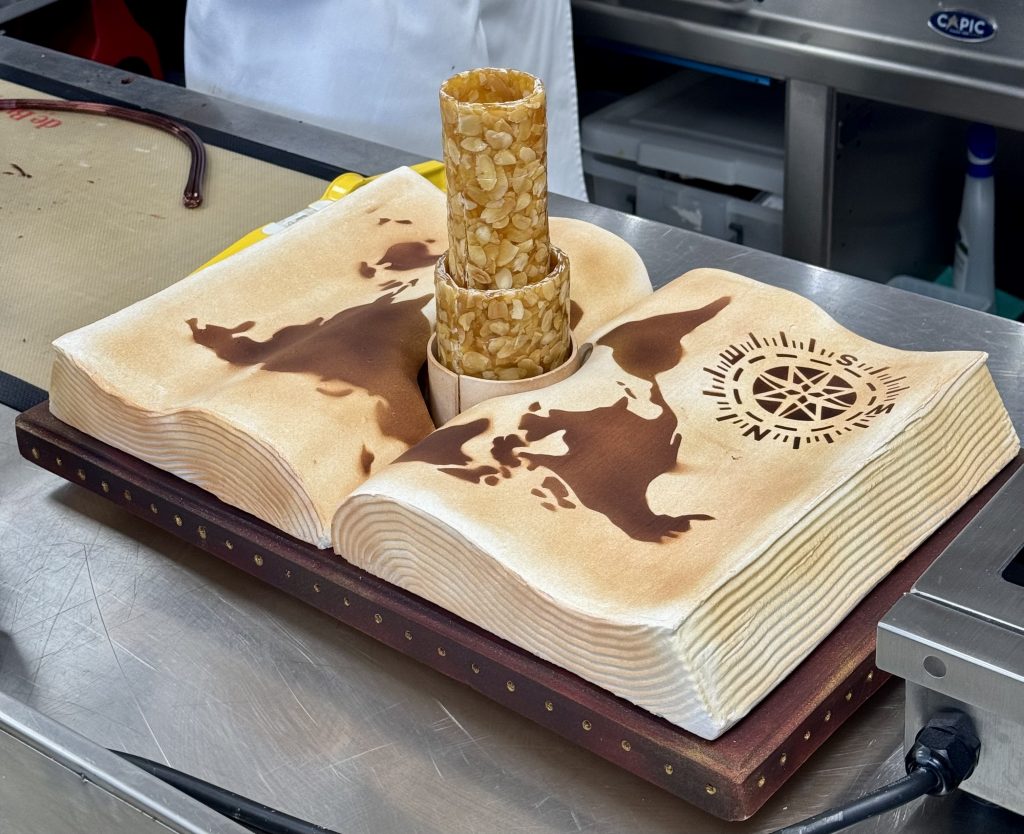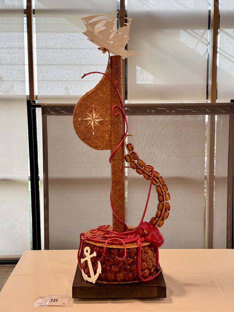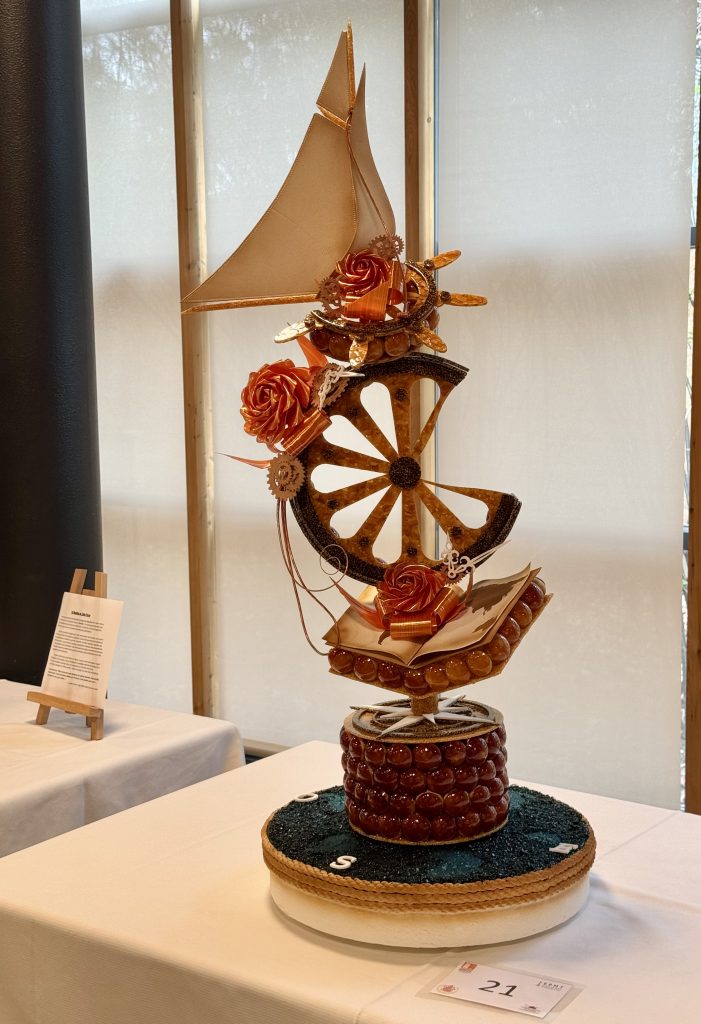 Du côté d’Evan et Mathéo, le travail du sucre tiré donne naissance à de superbes fleurs translucides, captant la lumière avec poésie. Plus loin, l’équipe de Maxence et Paul dévoile une pièce artistique audacieuse : une proue élancée et un mât dressé, peut-être une évocation du Sloughi, navire emblématique de L’Île mystérieuse ou de Deux ans de vacances.