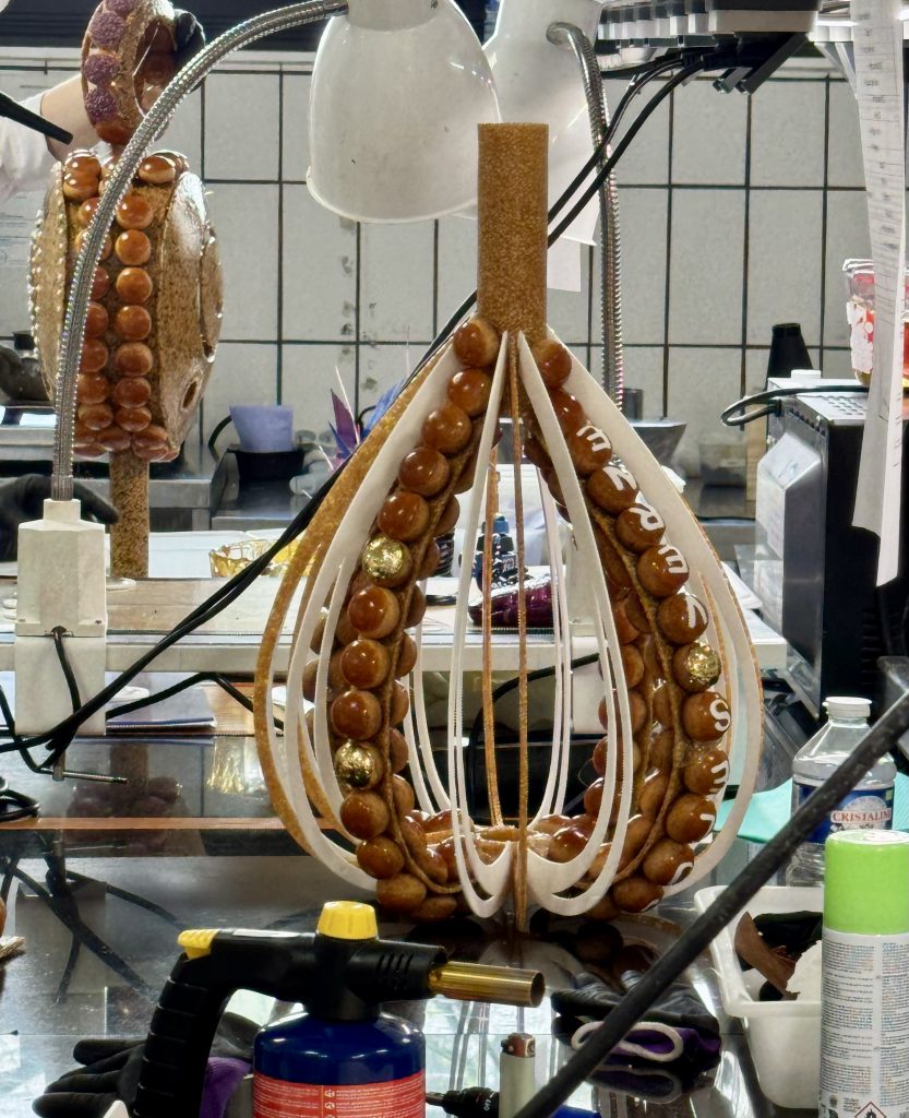 Le duo a choisi de représenter le voyage sous toutes ses formes, entre symboles et détails narratifs : « On a fait un mât au-dessus d’une base, avec une plume au centre. On a ajouté des voiles, des cordes pour rappeler le bateau, une sphère avec une planète à l’intérieur, et une grande fleur entourée d’arabesques pour donner de la majesté », explique-t-elle.