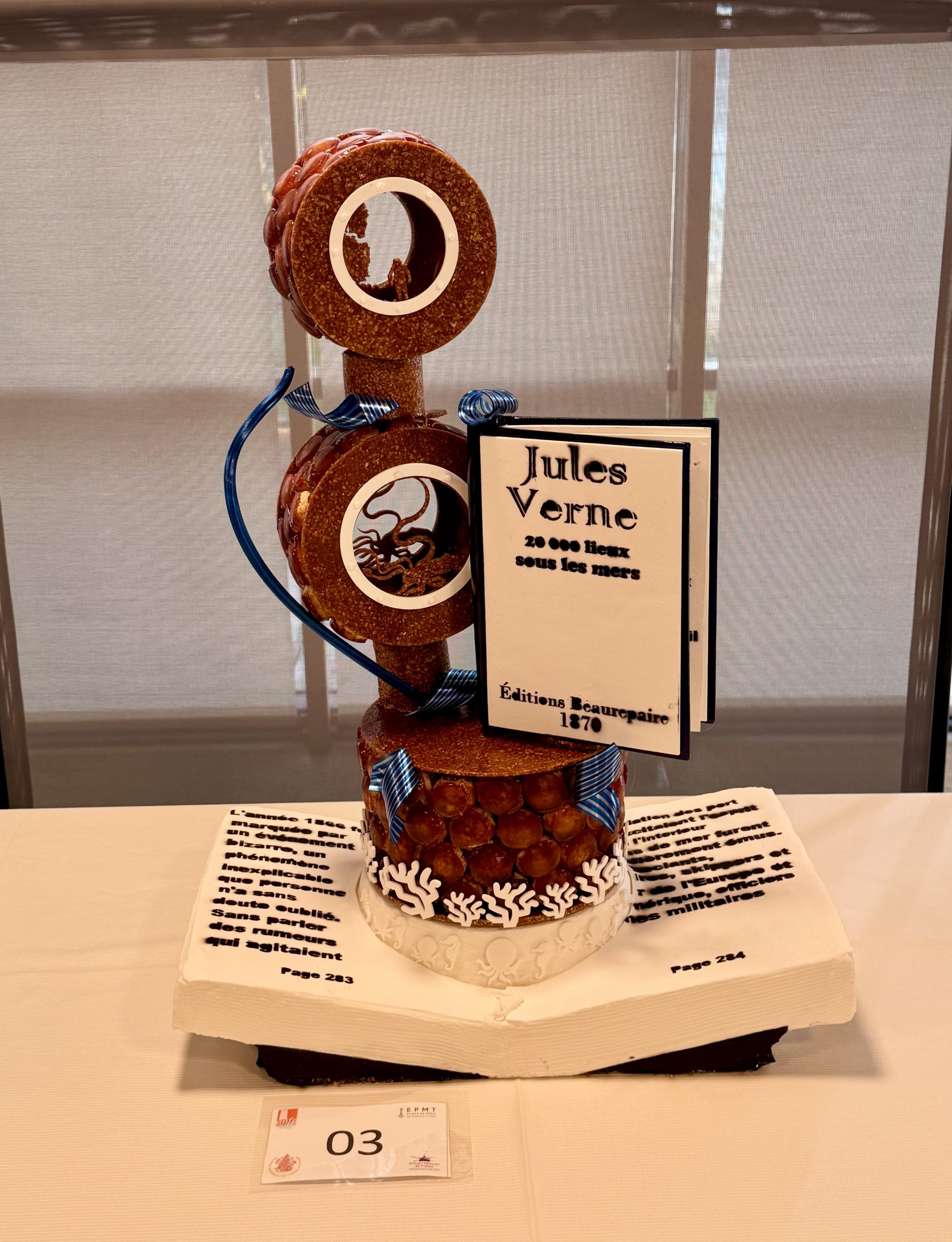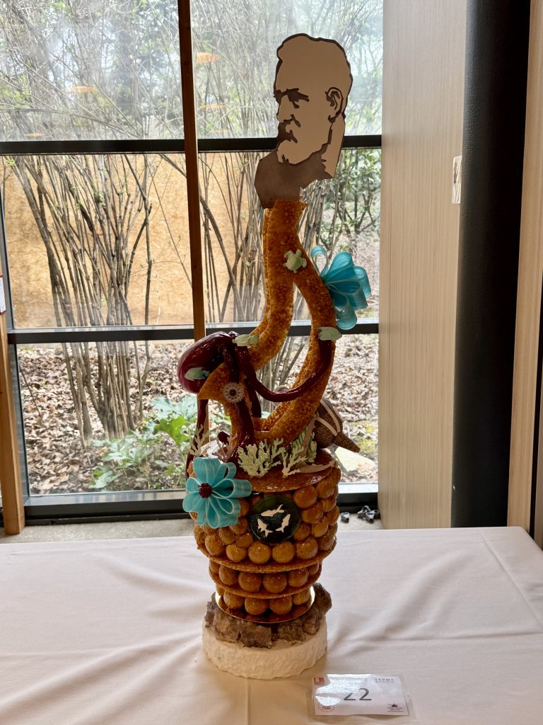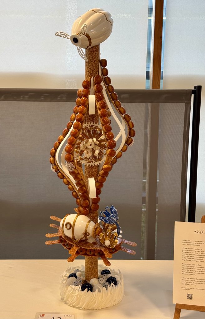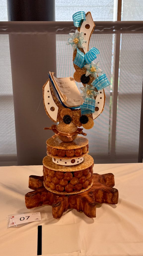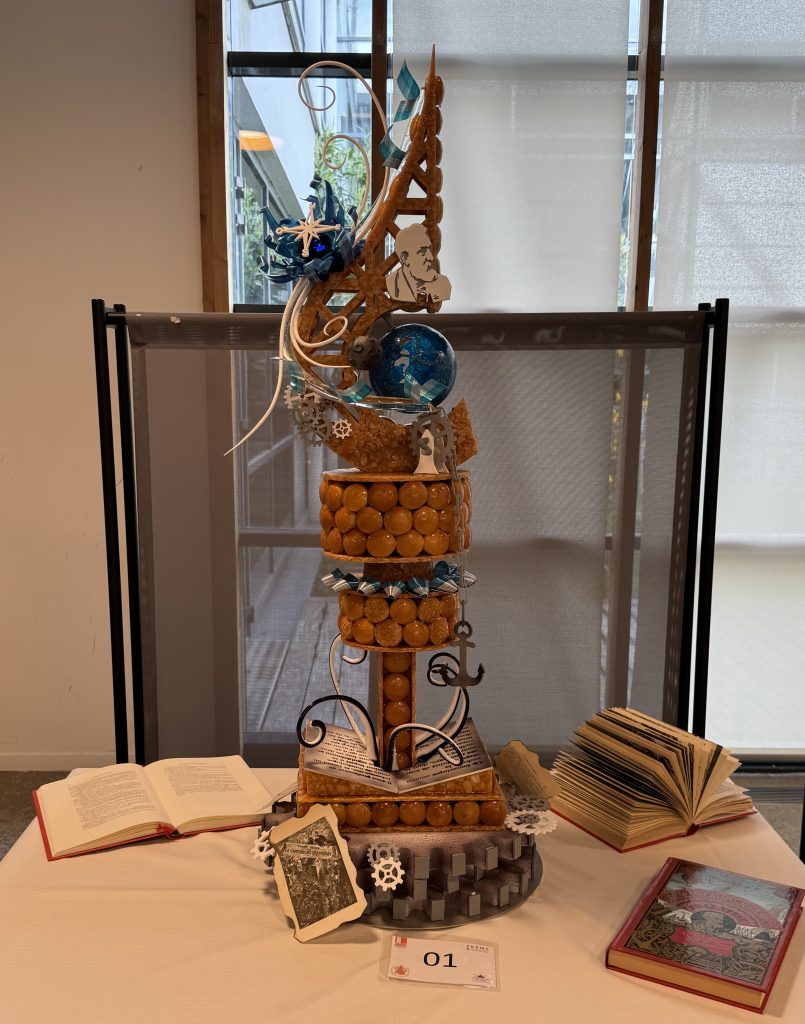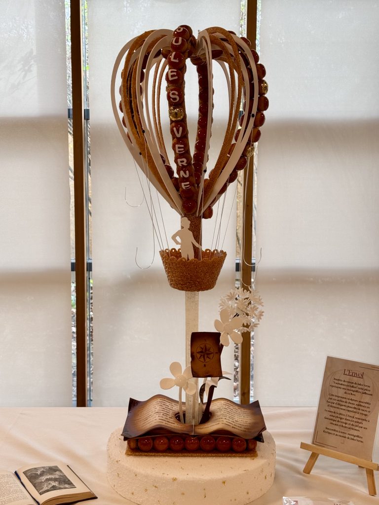Les gagnants ont proposé une interprétation à la fois poétique et maîtrisée de l’univers de Jules Verne, à travers un croquembouche majestueux et bien exécuté. Leur sculpture a marqué les esprits par sa maîtrise technique et son esthétisme. Inspirée des récits visionnaires de l’auteur, elle alliait finesse technique et narration visuelle : une montgolfière suspendue, symbole de Cinq semaines en ballon, une boussole évoquant Le Tour du monde en 80 jours, un avion rappelant Robur le Conquérant, un gouvernail faisant écho à Vingt mille lieues sous les mers et une planète représentant les voyages interplanétaires de De la Terre à la Lune.