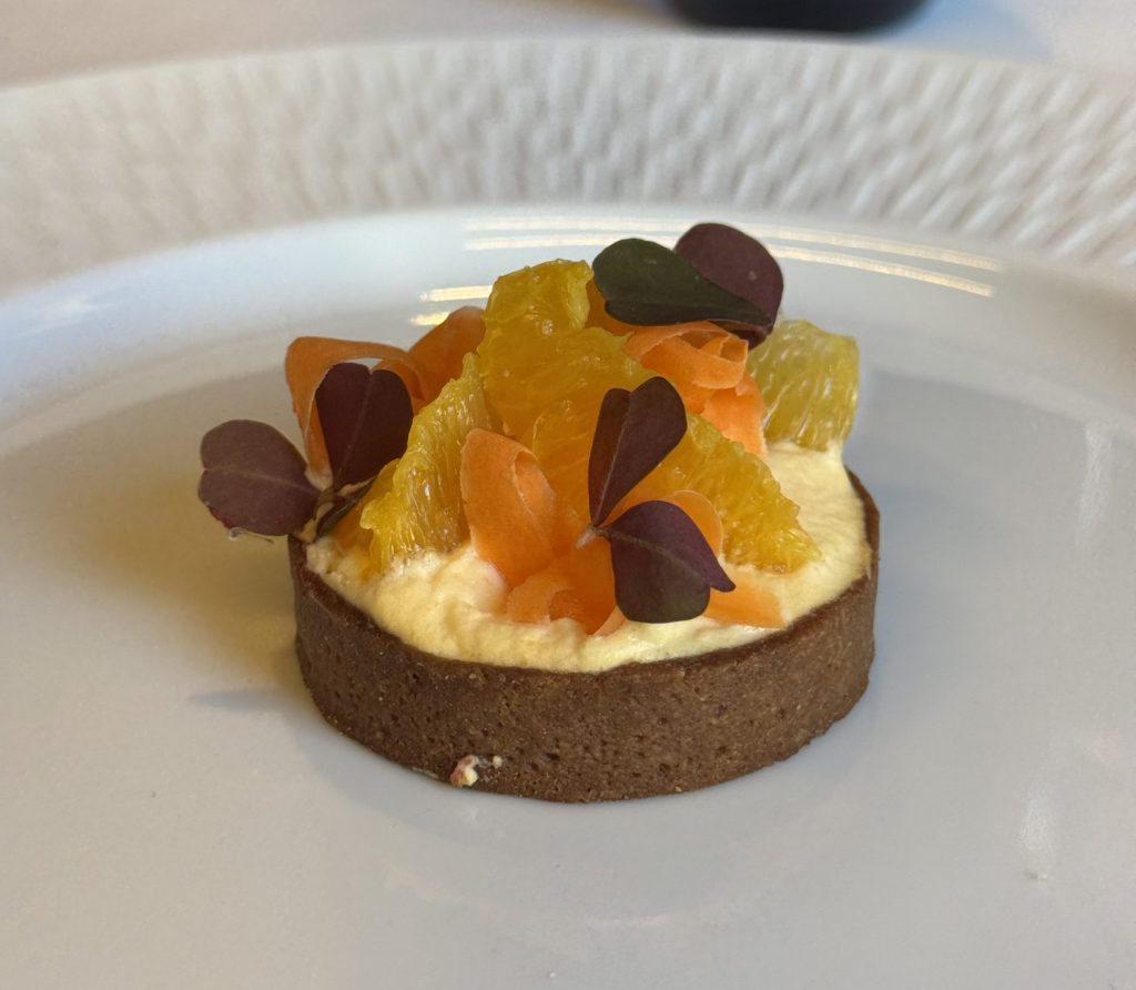 Les agrumes s’expriment pleinement, subtilement rehaussés par une pointe de clou de girofle. Le gingembre ajoute de la chaleur et le gel de vinaigre intensifie les contrastes, jouant sur l’acidité. Une crème légère, délicatement parfumée, accueille les agrumes et les carottes, agrémenté d’un praliné :