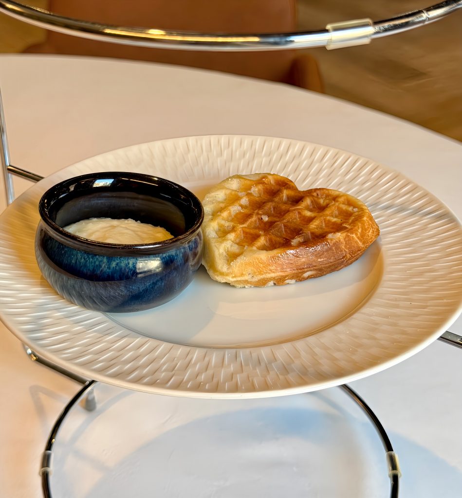 La verrine de fraises et céleri, léger et aérien, renferme une brunoise de céleri anisé et de fraises fraîches ajoutant de la texture. Le croquant du céleri, aux notes d’anis, crée un joli contraste avec la douceur fruitée des fraises. Les pousses d’astina apportent une fraîcheur herbacée qui lie l’ensemble. Cette composition joue sur les textures et les saveurs, comme un terrain de jeu pour les sens, préparant le palais à la suite du tea time.