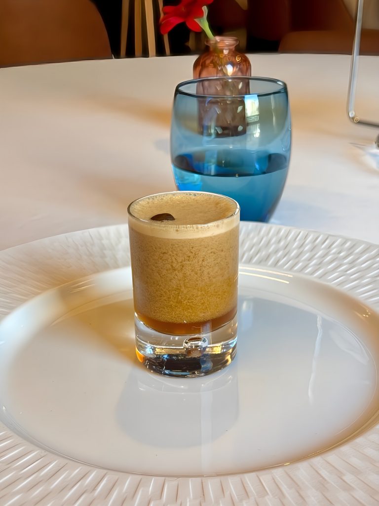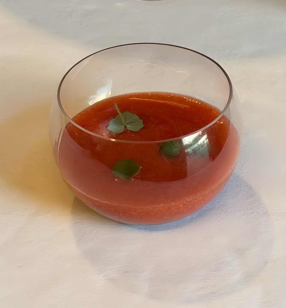 La verrine s’accompagne d’un cocktail à base de gin, liqueur Saint-Germain, Lillet blanc et infusion de thé vert à la menthe. Frais, floral et légèrement amer, ce breuvage prolonge la fraîcheur de la fraise et du céleri, avec des touches épicées et mielleuses qui apportent profondeur et complexité.