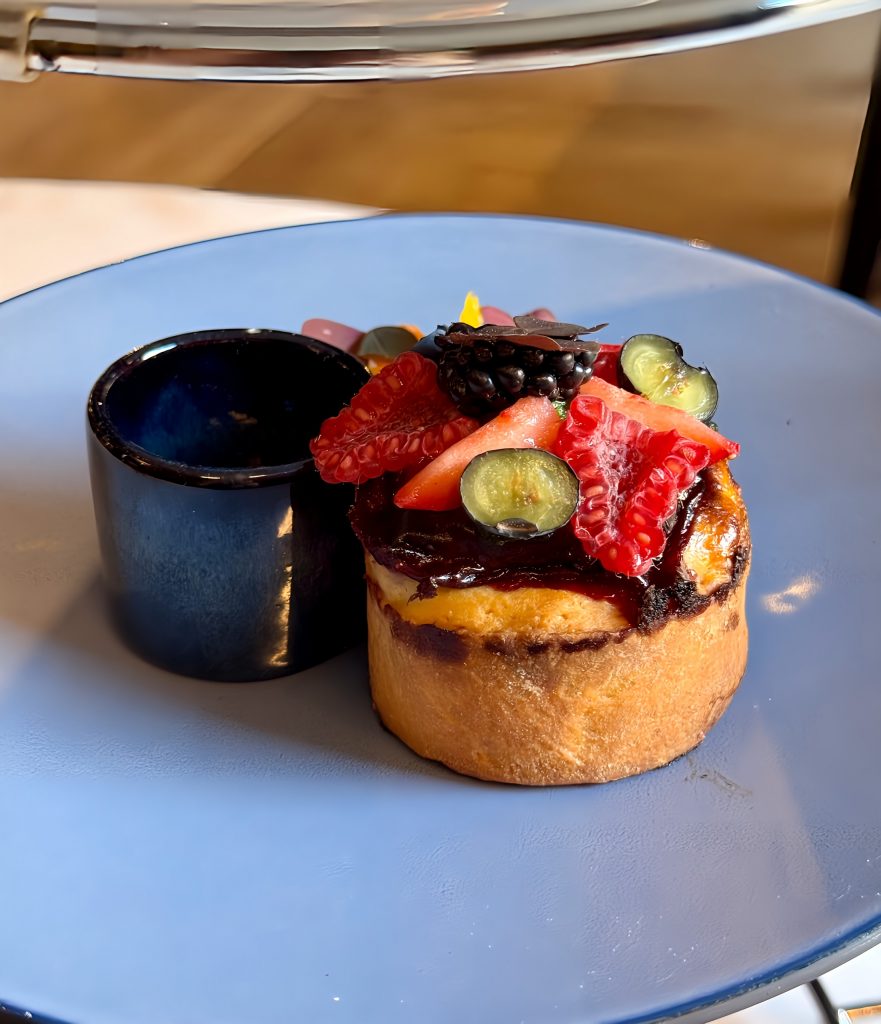 La brioche façon Babka arrive sur ma table, dévoilant sa mie filante, légère et aérée, fermentée. Elle est garnie de fruits rouges (framboises fraîches, mûres, bleuets et fraises) qui apportent une palette aromatique à la brioche. Une sauce aux fruits rouges épaisse l’accompagne, apportant de la douceur fruitée et de l’onctuosité, idéale pour compenser une mie légèrement sèche. Cette sauce, en plus de sa texture, offre une attaque douce suivie d’une note poivrée, ajoutant de la profondeur.Autre élément intéressant : une touche de pesto apporte une dimension végétale surprenante et une pointe de gingembre qui rehausse l’ensemble.