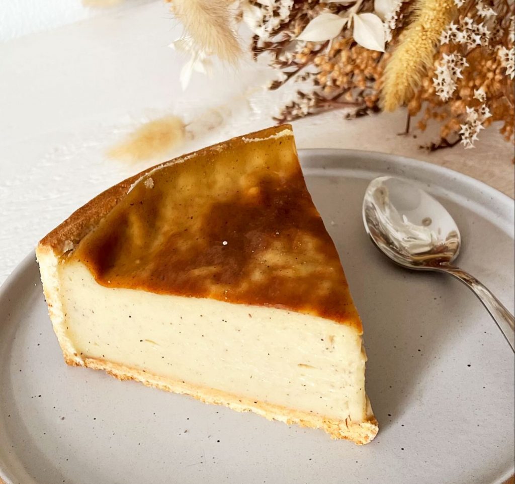 Après l’immensité du sable, de la forêt et du ciel, me voilà face à un autre paysage, plus intime : celui des pâtisseries bien alignées. Dans sa vitrine, pas de fioritures mais des formes épurées, des finitions parfaites, des glaçages miroitants. Autour d’un flan au lait d’avoine trônent des pots généreux de baba au rhum, de pudding aux fruits rouges et graines de chia, de chocolat orné de noisettes torréfiées ou encore de caramel et cacahuètes croquantes. La tarte au citron côtoie la tarte aux framboises, sans oublier la fameuse tarte Snickers qui attise notre gourmandise. Tout invite à la tentation.