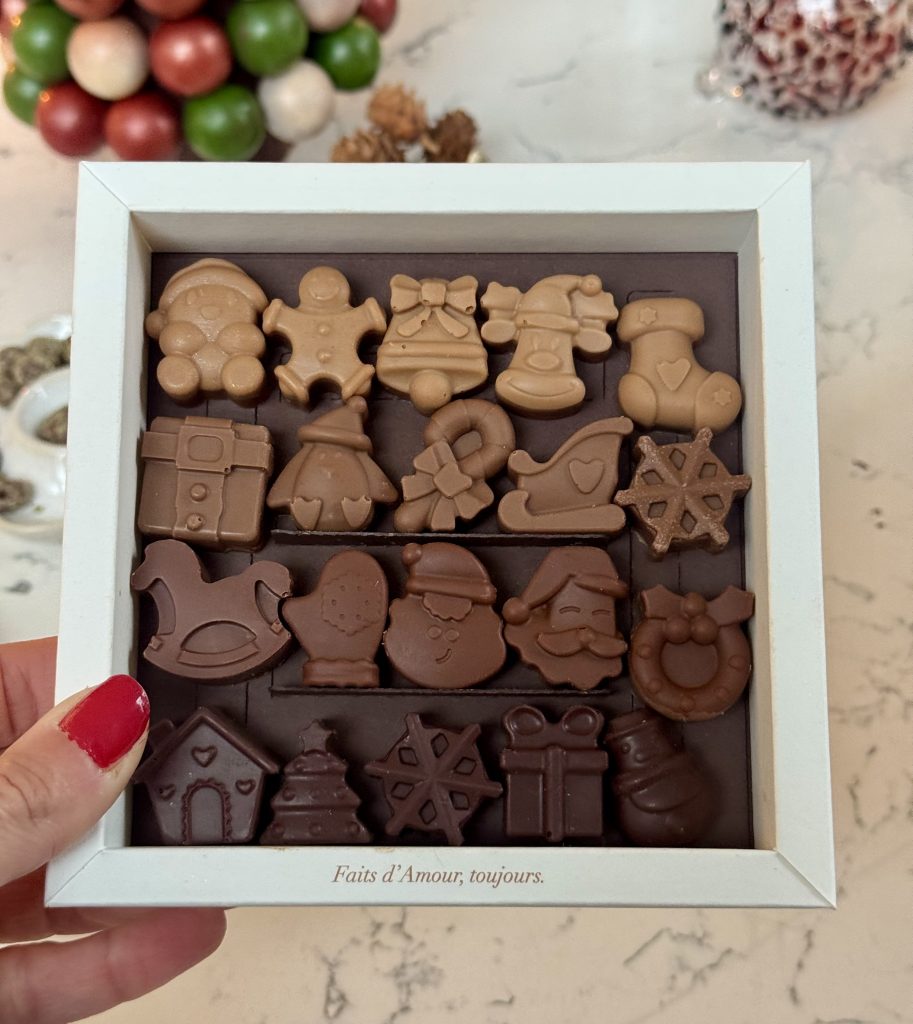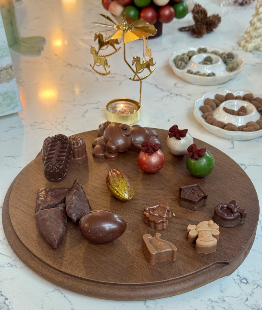 Petit coup de cœur de l’équipe. Ils ont essayé de faire les petits personnages de Noël qu’on retrouve accrochés au sapin. Ils ont fait 12 pralinés différents enrobés de chocolat noir ou lait.