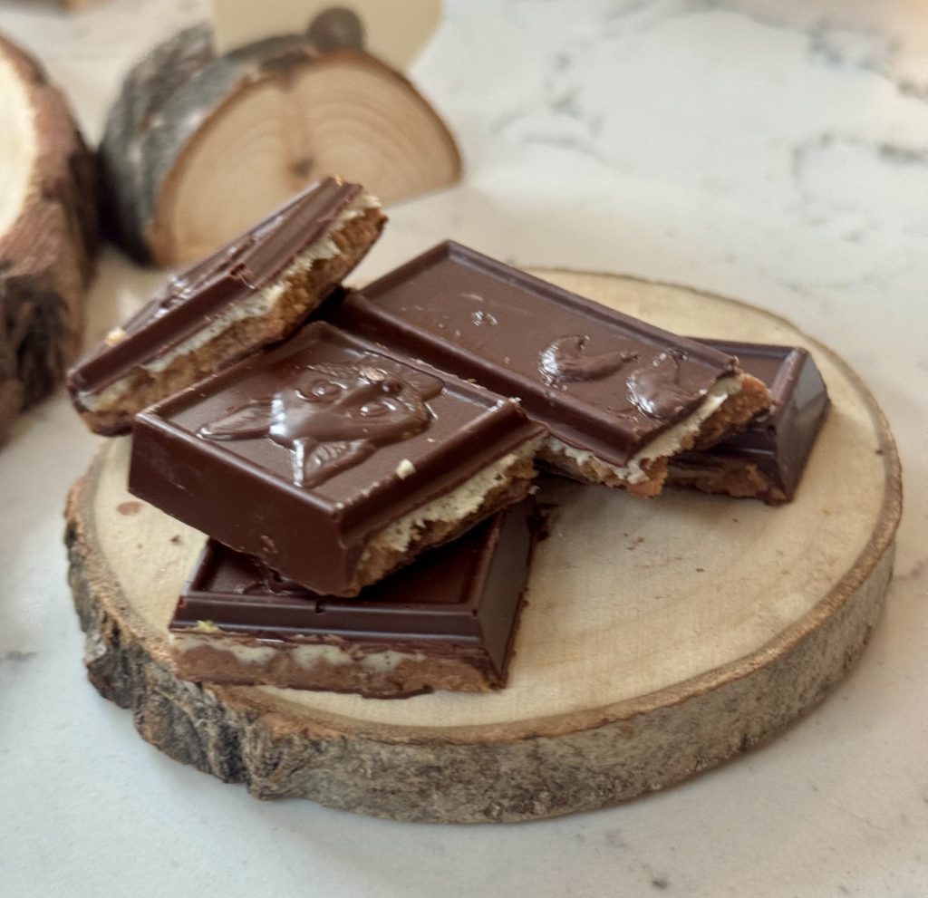 Faite avec les noisettes du verger, c’est une signature de PleinCoeur. La recette a changé. Il n’y a pas de chocolat, il y a du cacao assaisonné avec de la noisette, il n’y a pas de beurre de cacao dedans. Sa texture est lisse et fondante et son goût très prononcé en noisette. Une pointe de fleur de sel réveille les papilles en fin de bouche et rehausse l’ensemble. Une envolée de réconfort !