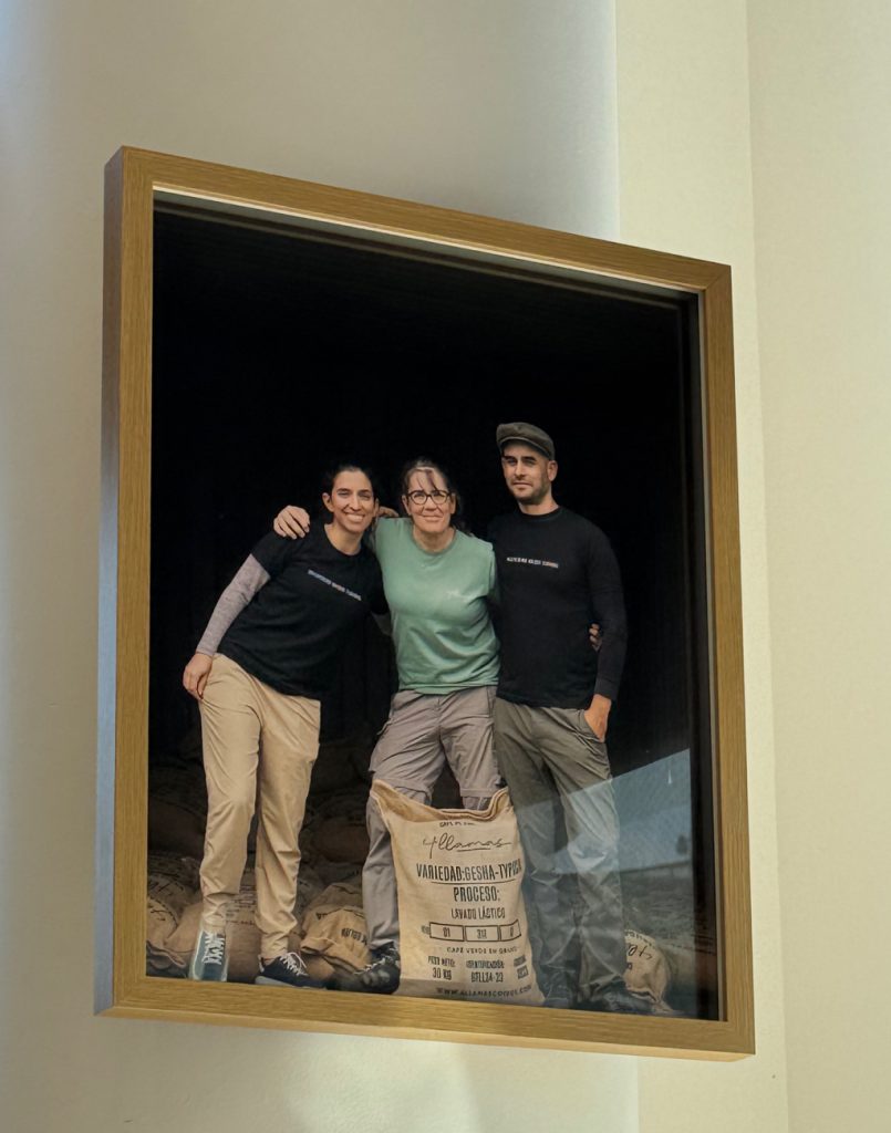 Une grande table festive est dressée, ornée de créations prêtes à faire chavirer nos papilles. Trépidante d’impatience à l’idée de les déguster, je ne sais plus où tourner le regard : les bûches disposées côte à côte attisent ma gourmandise. Des sapins de boules de Noël chocolatées aux couleurs festives trônent joyeusement sur la table. Et partout, sur les murs, des visages me regardent. Des photos de producteurs, comme autant de membres d’une famille.Car c’est bien de cela dont il s’agit ici, d’une famille. Celle du cœur. Celle de PleinCoeur. Tout fait sens.