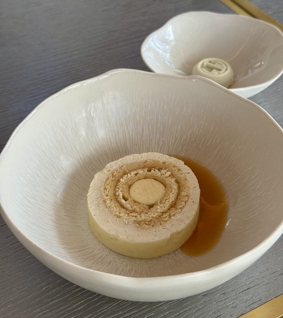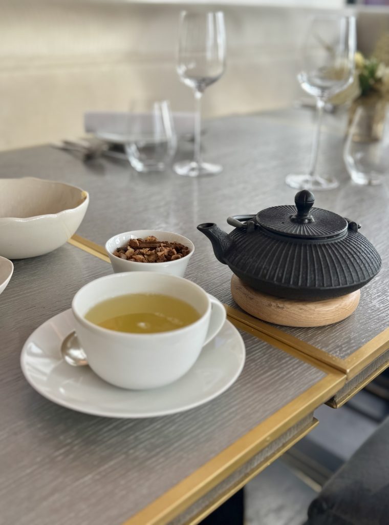 On nous sert alors un thé Jardin des Reines du Palais des Thés. Le parfum s’élève, floral, enveloppant. Notes d’amande caramélisée, touches de cannelle, note parfumée de pomme. Il réveille les sens avant même la première bouchée, prépare le palais à ce qui va suivre. Ce thé est le prélude d’un voyage gustatif et sensoriel pensé comme une narration, avec ses accords et ses contrastes.