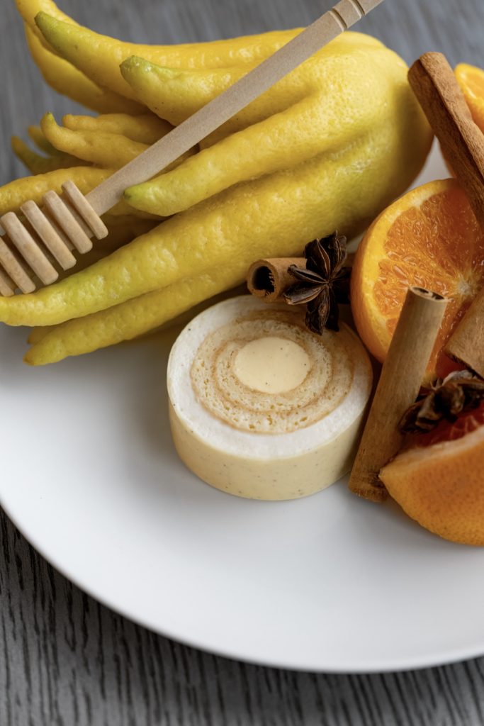 La fine coque de chocolat blanc cède et se rompt. Elle laisse entrevoir le biscuit d’épaisseur moyenne. Léger et aéré, il est imbibé d’orange sanguine qui le rend fondant et diffuse sa fraîcheur acidulée accentuant la sensation de fraîcheur et de légèreté. Le cœur crémeux aux agrumes apaisé par la rondeur vanillée apporte de l’onctuosité et des notes parfumées enivrantes renforcées par le confit de yuzu, puissant et tonique, qui ajoute de l’acidité équilibrant le côté gras du crémeux. L’ensemble est recouvert d’une mousse légère infusée aux épices de Noël, où domine la cannelle, soutenue par le miel de châtaignier qui ajoute du caractère et prolonge les notes aromatiques. Enfin, les tubes de décor en chocolat blanc dévoilent un praliné croustillant, qui apporte la mâche et la gourmandise, rafraîchi par les zestes de bergamote qui prolongent la dégustation par une touche fruitée subtile et persistante.