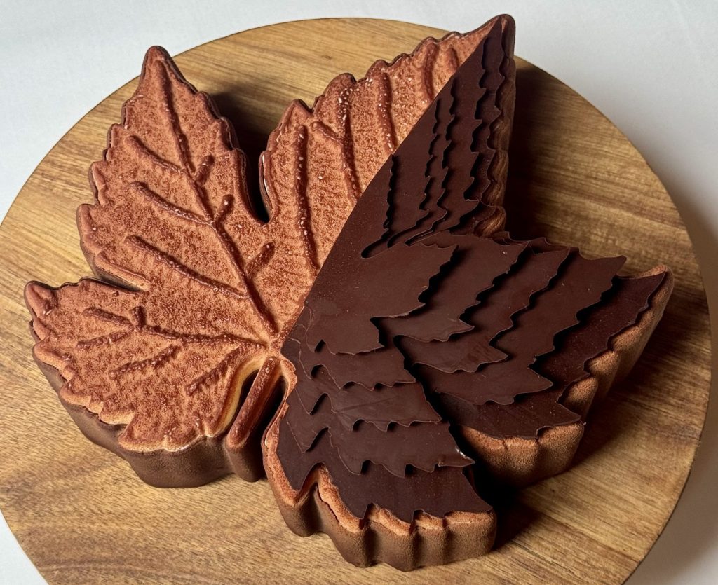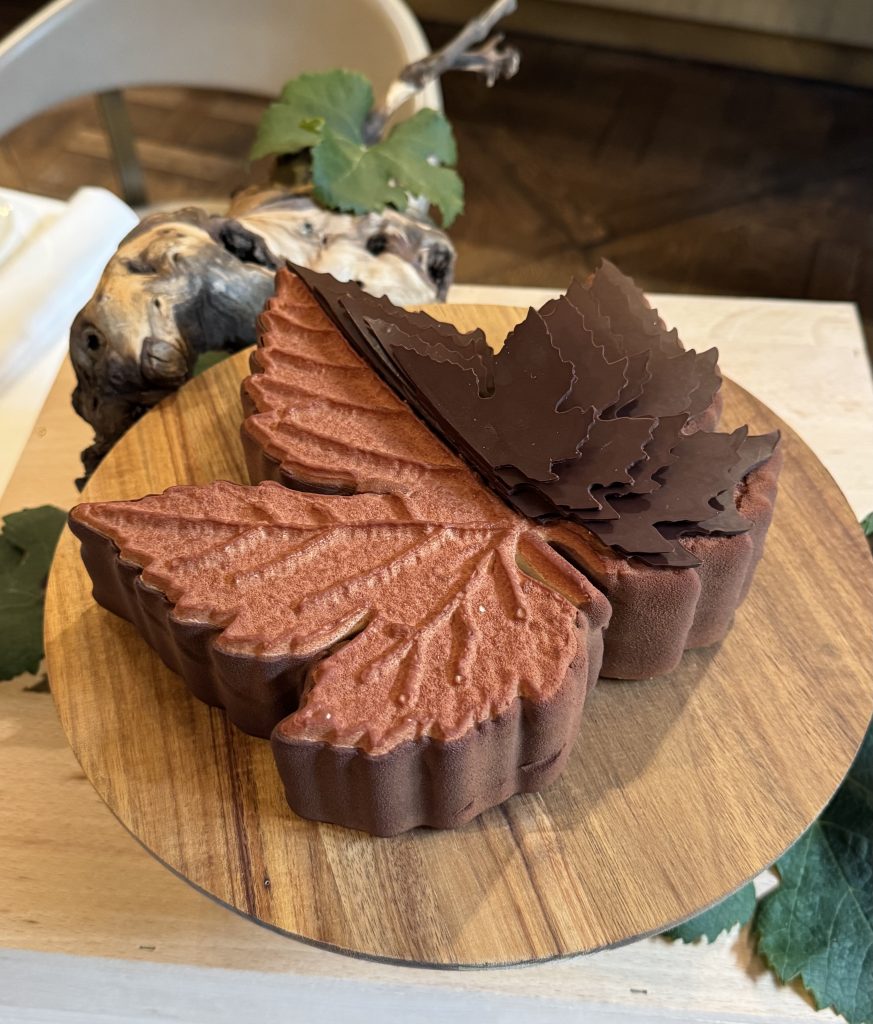Anthony était aux côtés de Nicolas Masse et ils présentaient ensemble leur création éponyme : “La Grand’Vigne”. Une bûche en forme de feuille de vigne, élégante, épurée, aux couleurs automnales avec un beau relief. Surmontée sur la moitié de délicates feuilles de vigne en chocolat assemblées en volume, elle rend hommage au vignoble qui l’entoure, au restaurant qui l’a vu naître.