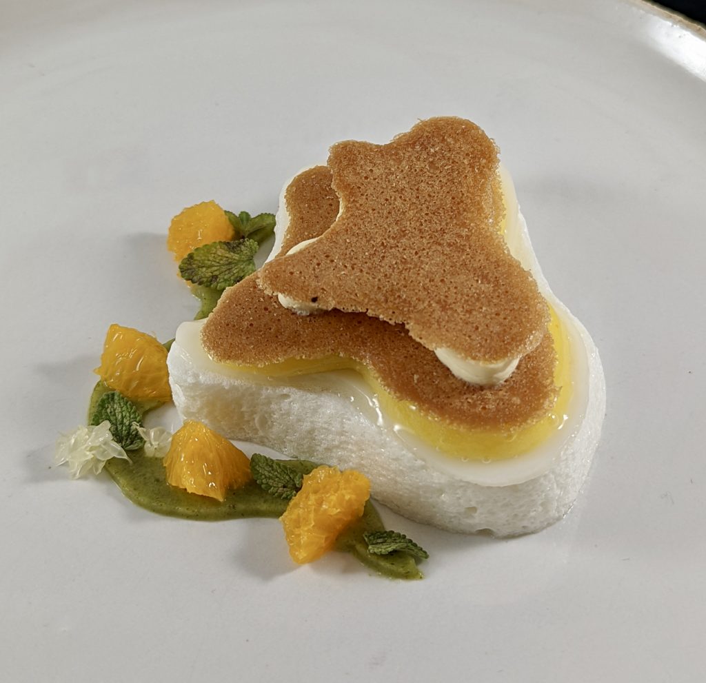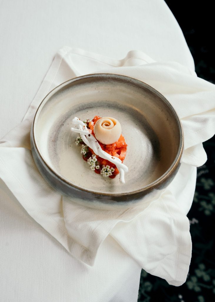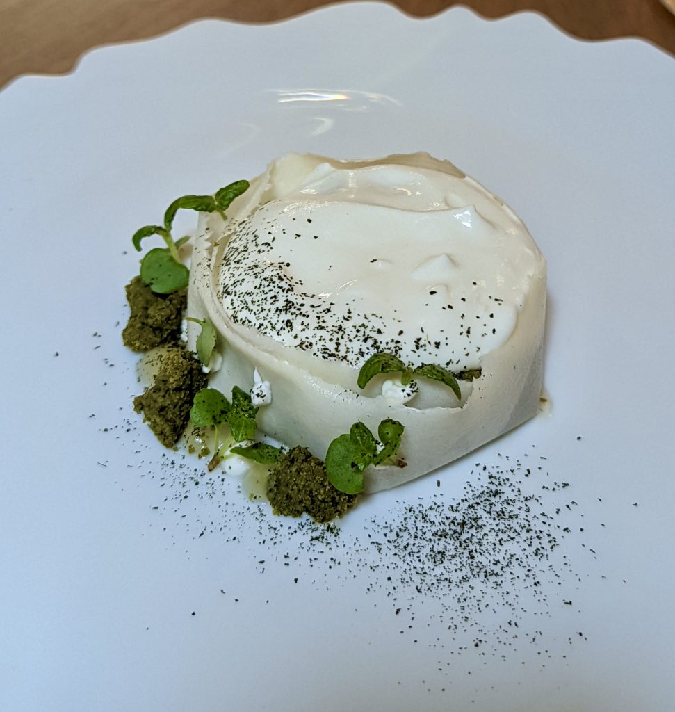 Son dessert signature : une raviole à l’herbe. Une création qui évolue chaque mois au gré des récoltes, comme si elle respirait au rythme de la nature : “L’idée c’était de faire comme une chartreuse, ou un trou normand, mais sans alcool. Avec toutes les herbes qu’on a dans le jardin, on fait ce dessert et il évolue tous les mois, parce qu’on n’a pas les mêmes herbes, mais l’idée c’était de faire un sorbet aux herbes, une raviole à l’huile de basilic, qui est faite à base de guimauve et à l’intérieur on va retrouver des pommes qui ont été marinées avec un peu de citron-caviar, et on vient perler une sauce à la feuille d’agrumes et à l’huile d’herbe.”