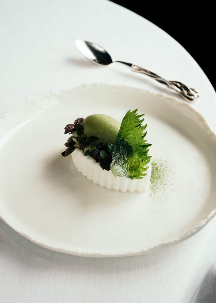 Dessert kiwi/shiso/matcha et fromage de brebis